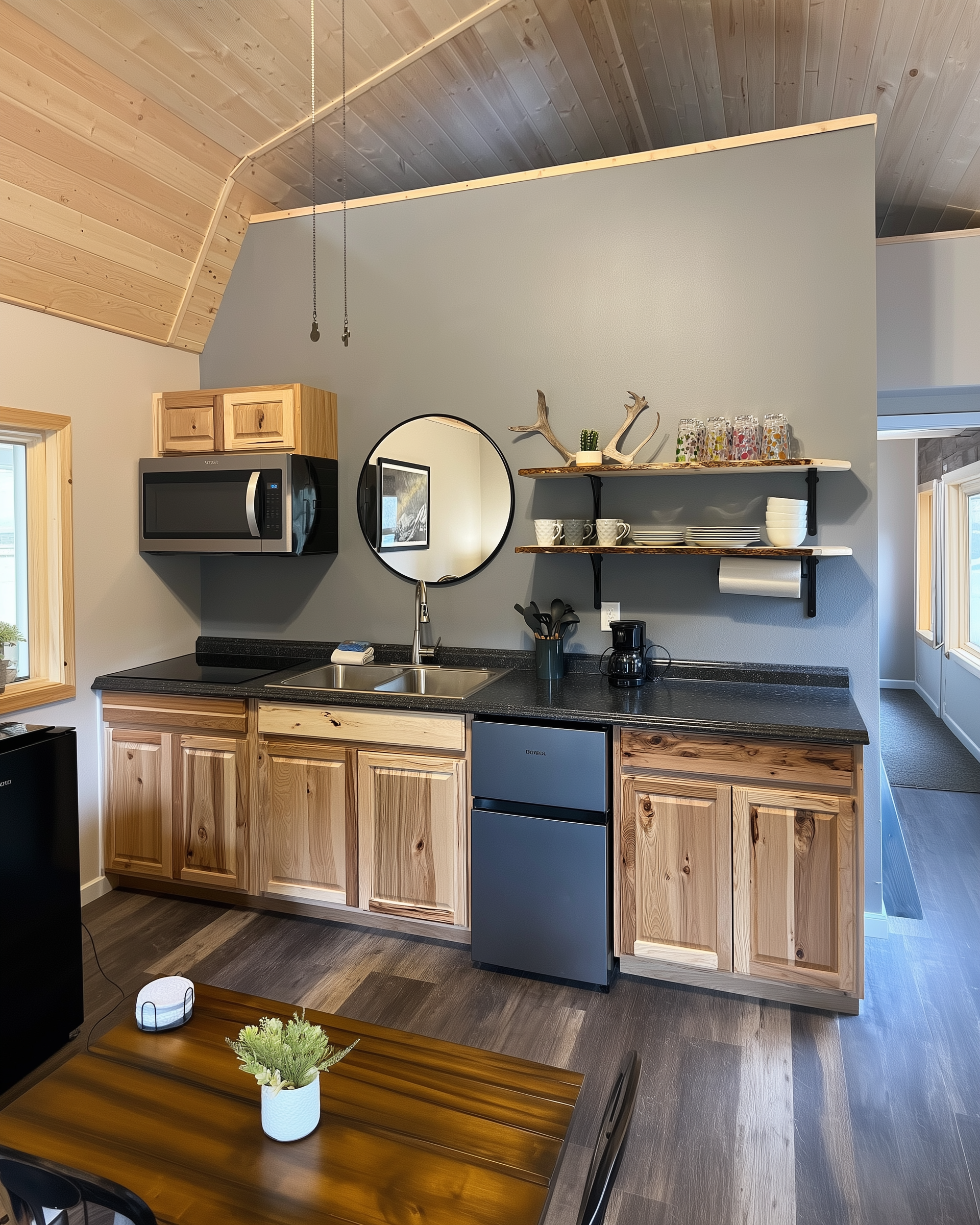 The open-concept interior includes thoughtful finishes, natural textures, and cozy decor. With wood-paneled walls, soft lighting, and everything you need to unwind, Mt. Alice Cabin offers a true Alaskan experience with just the right amount of comfort.